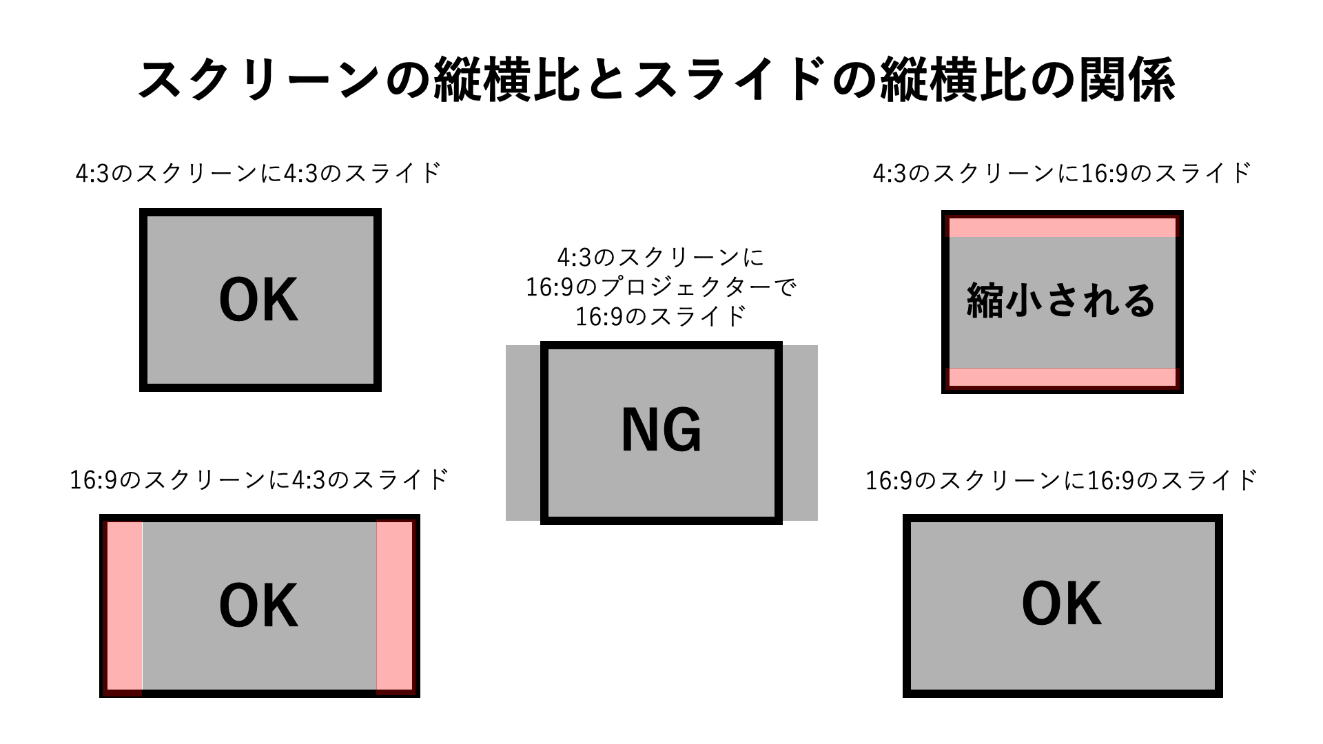 この時に16:9のスライドを用いると最悪で、スライドの両端がスクリーンに映らずはみ出してしまうことになります。